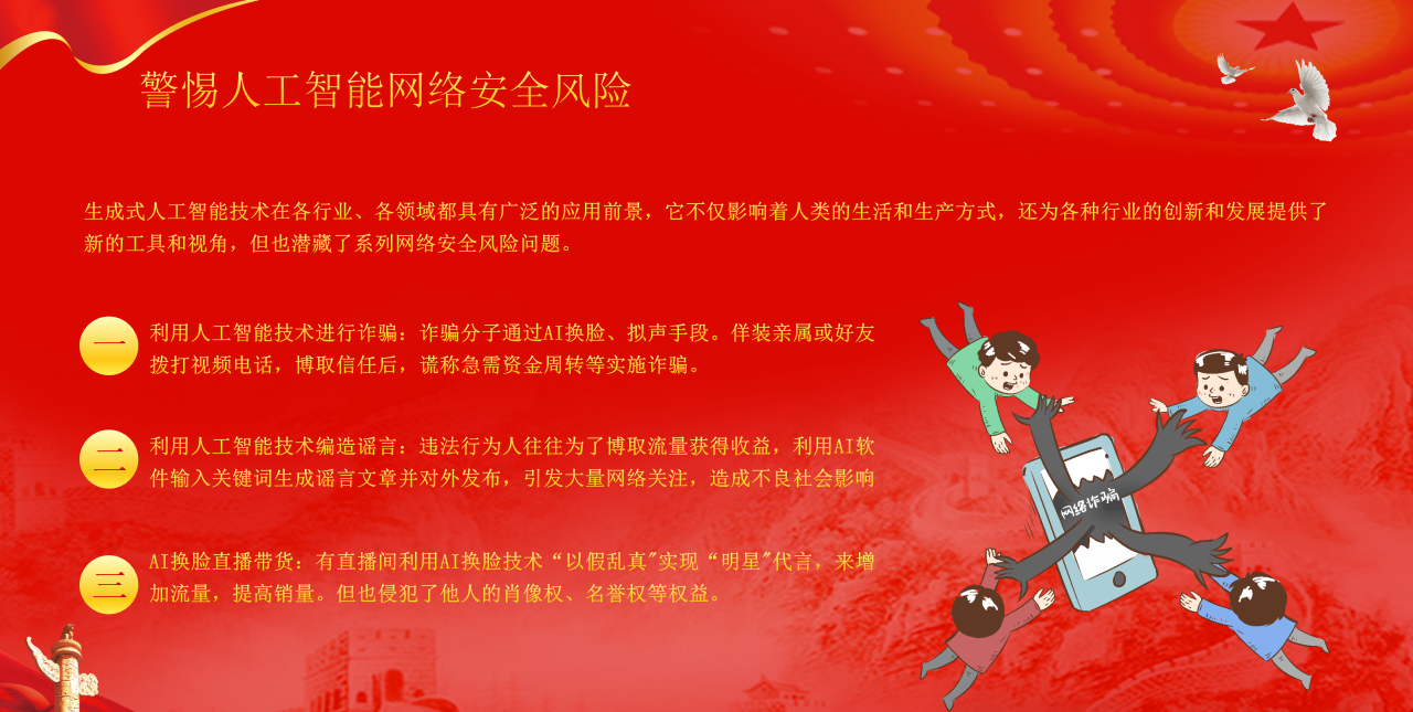人工智能在為生活帶來(lái)便利的同時(shí),也催生了新型網(wǎng)絡(luò)安全風(fēng)險(xiǎn)。這些風(fēng)險(xiǎn)不僅威脅個(gè)人財(cái)產(chǎn)安全,還可能擾亂社會(huì)秩序、侵犯知識(shí)產(chǎn)權(quán),需要我們高度警惕。網(wǎng)絡(luò)安全不是某一個(gè)人的事,而是我們每個(gè)人的事。 當(dāng)我們看到電信詐騙案中的受害者痛哭流涕,當(dāng)企業(yè)數(shù)據(jù)泄露導(dǎo)致千萬(wàn)用戶(hù)權(quán)益受損,當(dāng)關(guān)鍵信息基礎(chǔ)設(shè)施面臨潛在威脅,我們更能理解:個(gè)人的疏忽可能成為整個(gè)網(wǎng)絡(luò)的薄弱環(huán)節(jié),而每個(gè)人的警惕則能匯聚成堅(jiān)不可摧的安全力量。唯有全社會(huì)共同努力,才能筑牢這道無(wú)形的“防火墻”,織密覆蓋全民的“保護(hù)網(wǎng)”。