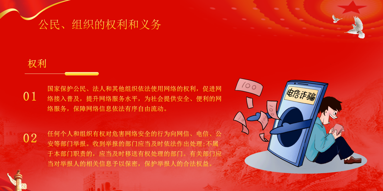 在網(wǎng)絡(luò)安全保障體系中,公民與組織依法享有的權(quán)利可分為"積極權(quán)利"與"消極權(quán)利"兩大維度,這兩類(lèi)權(quán)利共同構(gòu)筑了網(wǎng)絡(luò)空間的權(quán)益保護(hù)網(wǎng)。網(wǎng)絡(luò)安全不是某一個(gè)人的事,而是我們每個(gè)人都要守護(hù)的共同責(zé)任。作為公民和組織,在網(wǎng)絡(luò)空間里該怎么做、不該怎么做,其實(shí)有著清晰的“行為指南”。我們可以把這些責(zé)任分成三個(gè)層面來(lái)記:首先是必須守住的“底線(xiàn)義務(wù)”,其次是絕對(duì)不能碰的“禁止行為”,最后是千萬(wàn)別忽視的“協(xié)助責(zé)任”。